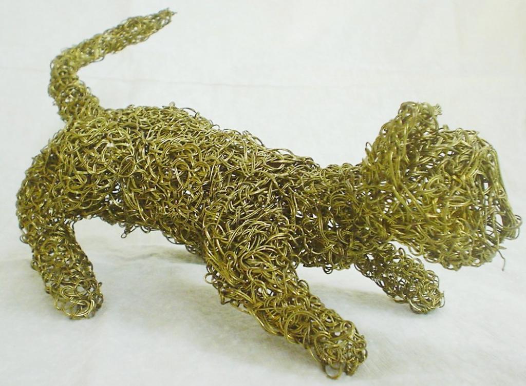 The "Brass Cat" is bright with many twists and turns of the wire material that is intertwined with itself. The gold color of the wire makes the piece appear energentic, with lots of movement. The stance of the cat, in horizontal pounce mode, also creates an animated feel to the art. An observer may feel as though the cat may be jumping out at them. The "Brass Cat" appears very lively because of its coloring, the shape, and the stance.
